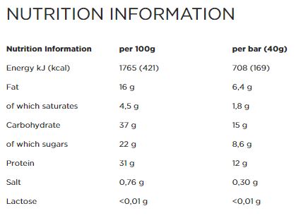 Съставки: печени фъстъци (22%), соев протеинов чипс (16%), (соев протеинов изолат, нишесте, сол), соев боб (12%), инвертен захарен сироп, малтодекстрин, грахов протеин (6%), кокосово масло, глюкозен сироп, фруктоза, тиквени семки (4,5%), овлажнител (глицерол), сол, натурален ароматизатор, екстракт от ванилия, емулгатор [лецитини (соев)]