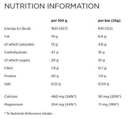 Съставки: пълномаслен млечен шоколад (23 %) [захар, какаово масло, пълномаслено МЛЯКО на прах, какаова маса, емулгатор (лецитини (СОЯ)), ароматизатор], глюкозен сироп, млечни протеини (19 %), инвертен захарен сироп, палмова мазнина, овлажнител (глицерол), изсушен кокос (4, 5 %), сладка суроватка на прах (МЛЯКО), олигофруктоза, кокосово мляко на прах (1,5 %) [кокосово мляко, малтодекстрин, натриев казеинат (МЛЯКО)], грахов протеин (1 %), магнезиев карбонат, калциев карбонат, ароматизатор, емулгатор [лецитини (СОЯ)].