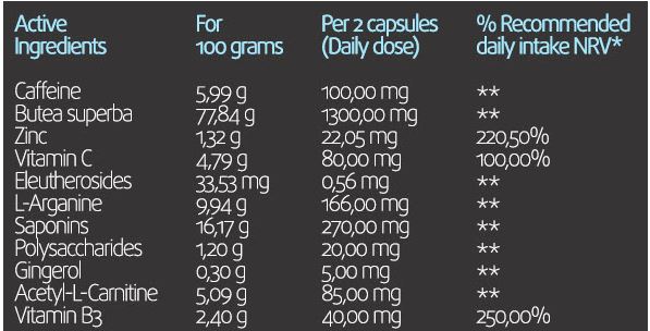 Съставки: Кофеин, цинк, Butea Superba, L-аргинин, сапонини, полизахариди