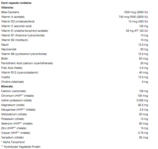 Cъcтaвĸи: Бета-каротен, Биотин /Витамин Б7/, Ванадий, Витамин А / Vitamin A, Витамин Б1 / Vitamin B1, Витамин Б12 / Vitamin B12, Витамин Б2 / Vitamin B2, Витамин Б6 / Vitamin B6, Витамин Д3 / Vitamin D3, Витамин Е / Vitamin E, Витамин Ц / Vitamin C, Гроздово семе /екстракт/, Желязо, Индол-3-карбинол, Инозитол, Йод, Калий, Калций, Лутеин, Магнезий, Манган, Мед, Молибден, Ниацин /Витамин Б3 / Vitamin B3/, ПАБА (пара-аминобензоена киселина), Пантотенова киселина /Витамин Б5 / Vitamin B5/, Селен, Фолиева киселина (Витамин Б9 / Vitamin B9), Холин /Витамин Б4 / Vitamin B4/, Хром, Цинк, Цитрусови биофлавони