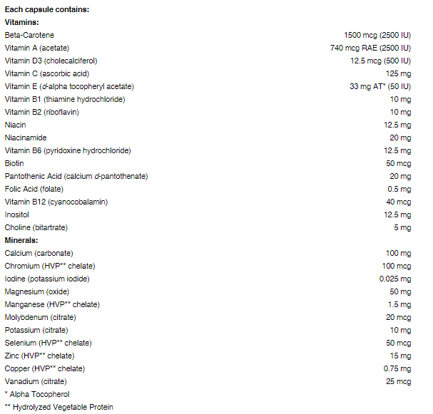 Желатинова капсула (желатин, пречистена вода, титанов диоксид), растителен магнезиев стеарат (смазка), микрокристална целулоза, оризово нишесте, силициев диоксид.