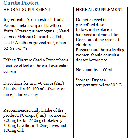 Съставки: Билкова тинктура, екстракт от арония, маточина, копър, глог.