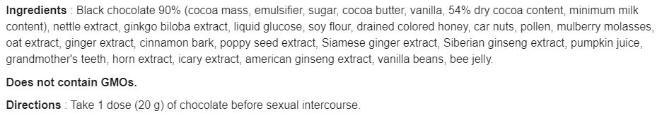 Съставки: Черен шоколад,Екстракт от коприва,екстракт от гинко билоба,течна глюкоза,соево брашно,меласа,екстракт от пшеница,екстракт от джинджифил,канела