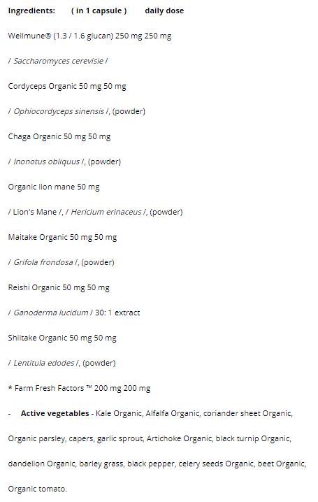 Съставки: Органичен ектстракт от Майтаке, Шийтаке, Рейши, Кордицепс, Чага и Лъвска грива, Органичен кейл, Органична люцерна, Органичен кориандър, Органичен магданоз, Плодове от каперси, Органичен артишок, Органична черна ряпа, Ечемик, Лют червен пипер, Органична целина, Органично цвекло, Органичен домат, Уасаби, Броколи, Ряпа, Репичка, Органичен карфиол, Органично зеле, Органична рукола, Органична поточарка, Чесън, Грозде, Нар, Ягода, Органична черна боровинка, Органична боровинка, Малина, Органично грозде, Китайски лимонник, Червен портокал, Органично акай бери, Theracurmin®, Органичен безкофеинов зелен чай, Органичен бял трън, Органичен джинджифил, Органична ехинацея, Турта, Органично глухарче, Органичен риган, Органична мента, Органичен джоджен, органична спирулина, органична хлорела, червени водорасли, синьо зелени водорасли, саналина Dunaliella, водорасли.
