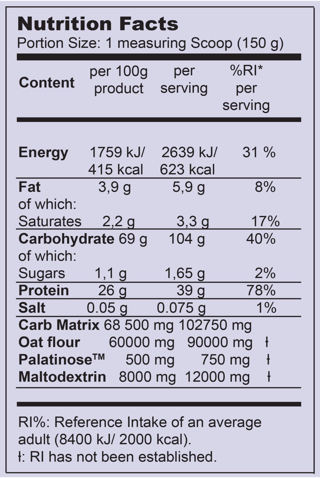 Съставки: суроватъчен протеин концентрат , карбохидратна матрица [овесено брашно, малтодекстрин, палатиноза ТМ (изомалтулоза **)], обезмаслено мляко на прах / обезмаслено какао на прах 10%, ароматизатори, емулгатор (натриева карбоксиметил целулоза), подсладител (сукралоза). ** Изомалтулозата (PalatinoseTM) е източник на глюкоза и фруктоза.