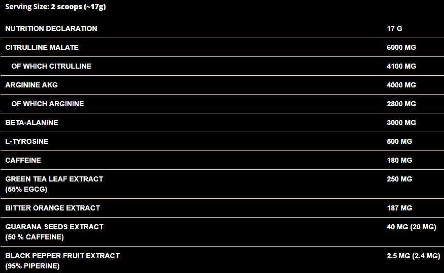 Cъcтaвĸи: Аргинин, цитрулин, нета-Аланин и кофеин, тирозин, зелен Чай, горчив портокал, Гуарана и екстракт от черен пипер