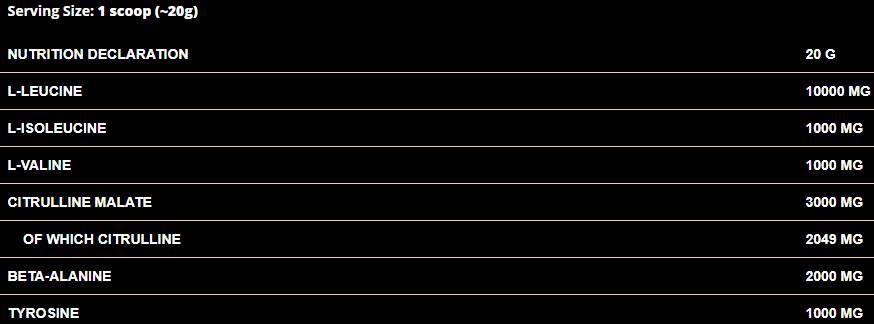Cъcтaвĸи: BCAA (L-левцин, L-изолевцин, L-валин), цитрулин малат, бета-аланин, тирозин, средства против слепване (E551, E3411), регулатор на киселинността (лимонена киселина), аромат, цвят (E160a), червен Концентрат от сок от цвекло, подсладител (сукралоза).