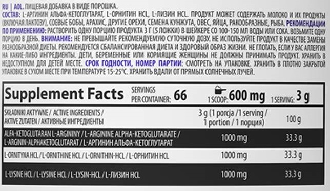 Съставки: Л-аргинин алфа-кетоглутарат, Л-орнитин HCL, Л-лизин HCL