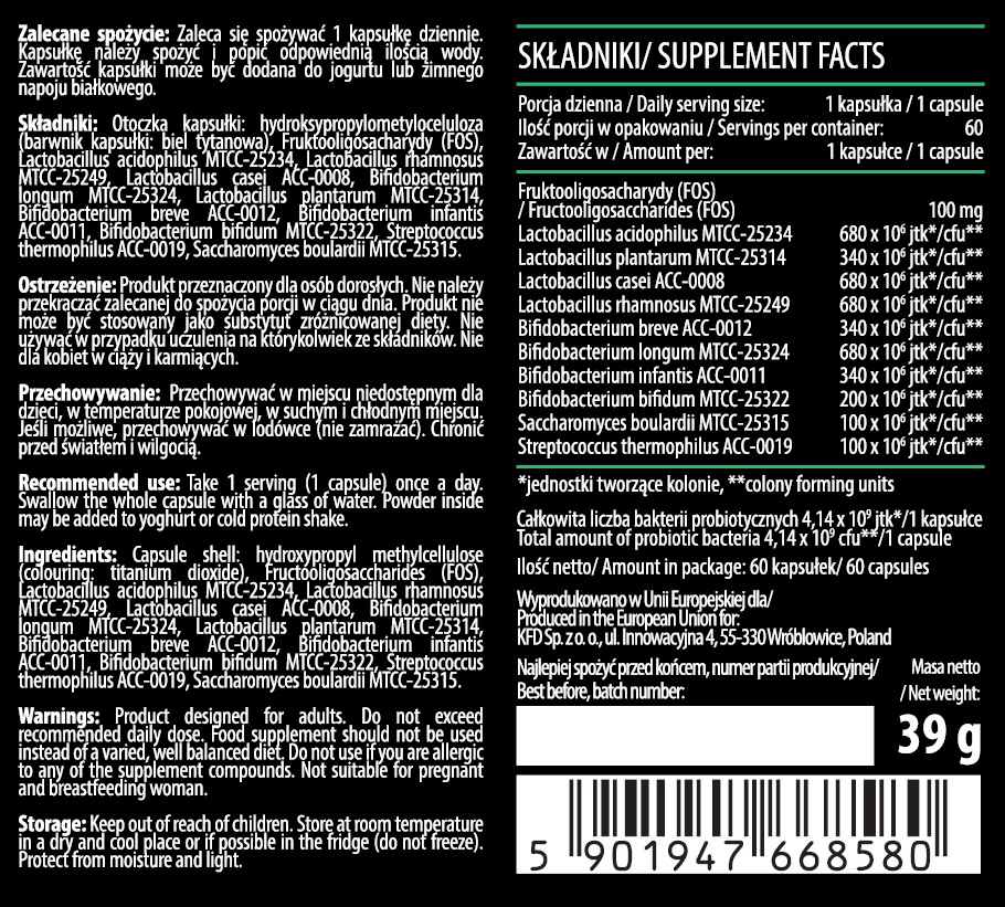 KFD Probiotic снабдява организма ви с 4,14 милиарда добри бактерии, които спомагат за възстановяването на колонията от пробиотични микроорганизми, което при продължителна употреба гарантира, че здравето на вашата чревна микрофлора ще е много добро.
