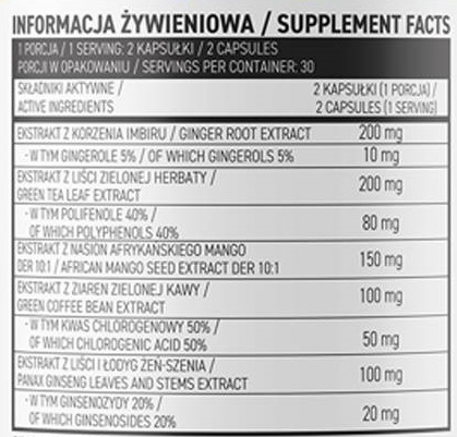 Съставки: Екстракт от корен на джинджифил (Zingiber officinale Rosc.) - 5% гингероли, екстракт от лист от зелен чай (Camellia sinensis (L.) Kuntze) - 40% полифеноли, екстракт от семена от африканско манго (Irvingia gabonensis L.) DER 10: 1, зелено кафено зърно екстракт (Coffea L.) - 50% хлорогенна киселина, екстракт от листа и стъбла на панакс женшен