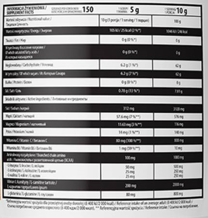 Съставки: Глюкоза, натриев хлорид (натрий), киселина: лимонена киселина; аромати, L-карнитин тартарат, калциев карбонат (калций), аминокиселини с разклонена верига BCAA (L-левцин, L-изолевцин, L-валин), багрило: каротини; L-аскорбинова киселина (витамин С), L-глутамин, магнезиев цитрат (магнезий), калиев цитрат (калий), концентрат на прах от цвекло, подсладители: сукралоза, ацесулфам К; пиридоксин хидрохлорид (витамин В6).