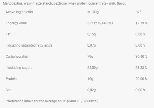 Съставки: Малтодекстрин, восъчно царевично нишесте (восъчна царевица), декстроза, концентрат на суроватъчен протеин - мляко, аромат на аромат.