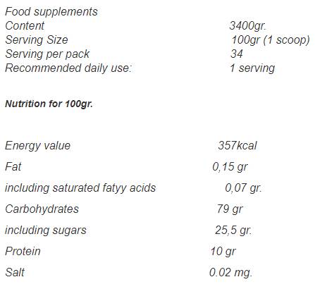 Съставки: Малтодекстрин, восъчно царевично нишесте (восъчна царевица), декстроза, концентрат на суроватъчен протеин - мляко, аромат на аромат.