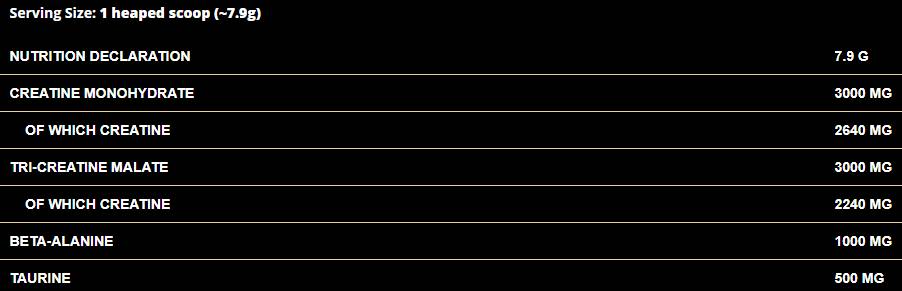 Cъcтaвĸи: Creatine monohydrate, Tri-creatine malate, Beta-alanine, Taurine, Creatine Monohydrate, Tri-Creatine Malate, Beta-Alanine, Taurine, Anti-Caking Agents (E551, E341), Sweetener (Sucralose), Colour E160a, Red Beet Juice Concentrate.