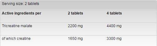 Cъcтaвĸи: Трикреатин малат, насипващ агент E460 (i), малтодекстрин, насипващ агент E341, антислепващи агенти (E470b, E553b), глазуращи средства (E1521, E1203, E464), цвят E171, емулгатор E322.