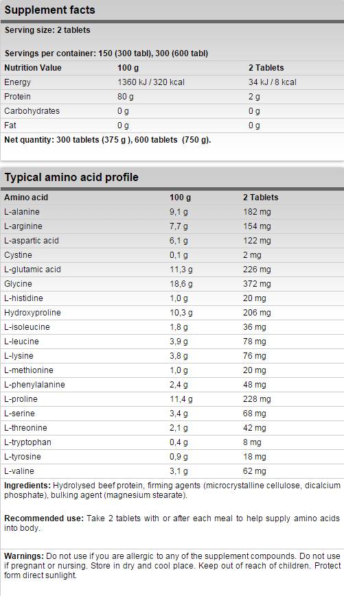 Cъcтaвĸи: Хидролизиран говежди протеин, стягащи агенти (микрокристална целулоза, дикалциев фосфат), пълнител (магнезиев стеарат)