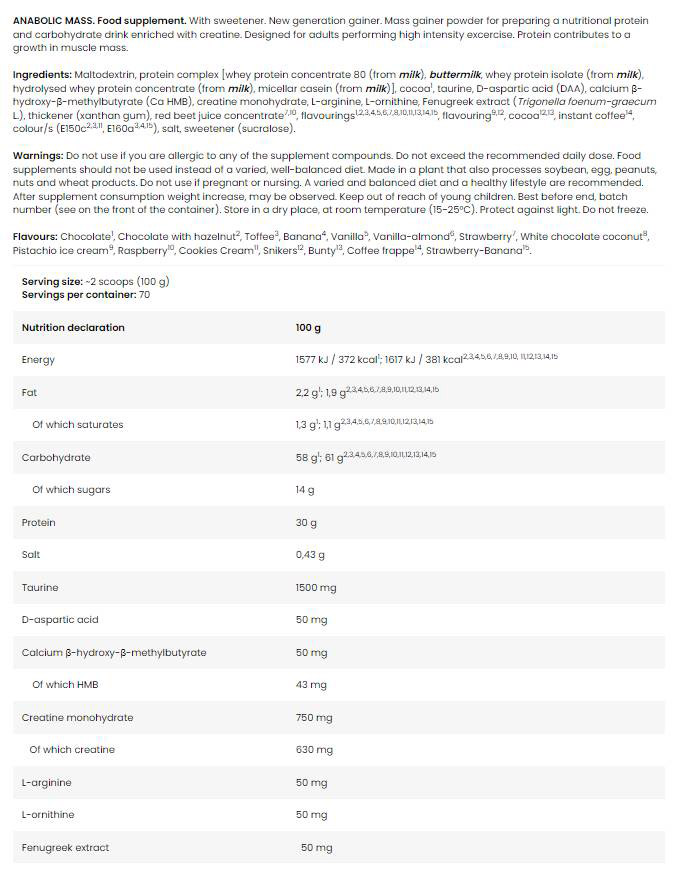 KEVIN LEVRONE Black Line / Anabolic Mass съдържа суроватъчен протеин концентрат, суроватъчен протеин изолат, суроватъчен хидролизат и казеинов хидролизат, които позволяват на мускулите на се наситят с пълен набор от аминокиселини за дълъг период от време.