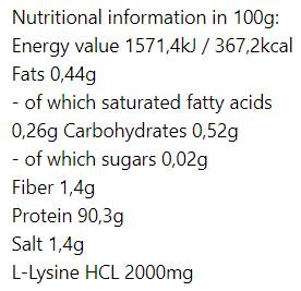 Съдържание:Телешки протеинов хидролизат, обезмаслено какао, L-лизин хидрохлорид, таурин, сукроза, аромат, сгъстител (карбоксиметил целулоза), подсладители (сукралоза Е955), антислепващ агент (силициев диоксид).