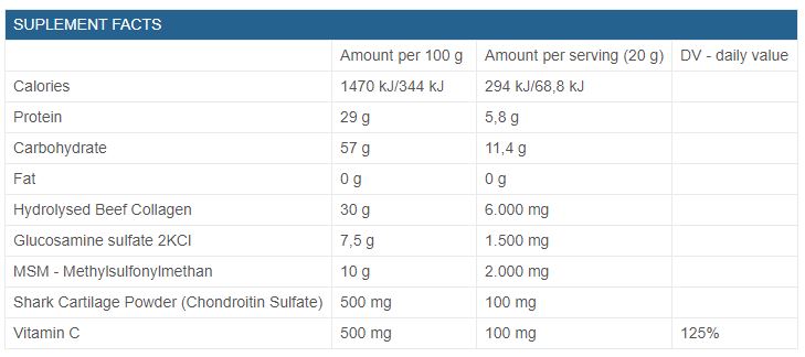 Съставки: Хидролизиран телешки колаген, глюкозамин сулфат, метилсулфонилметан (МСМ), хрущял от акула на прах, витамин Ц, малтодекстрин, захароза, декстроза, аромат на малина, подсладители: сукралоза, лимонена киселина, прах от цвекло.