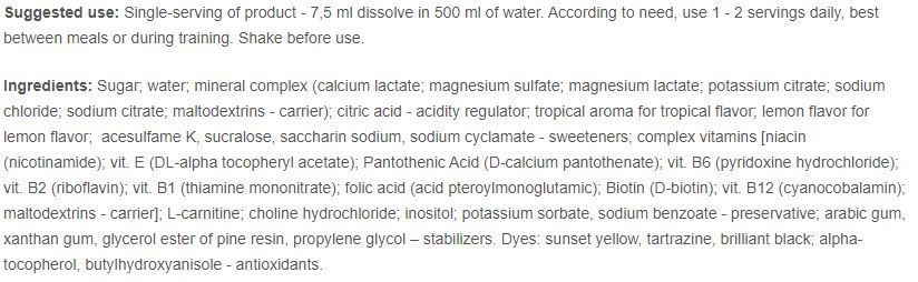 Cъcтaвĸи: Сироп, вода, малтодекстрин, таурин, глицин, L-карнитин, фруктоза, магнезиев цитрат, натриев хлорид, калиев хлорид, калциев лактат, калиев дихидроген фосфат, аромати,