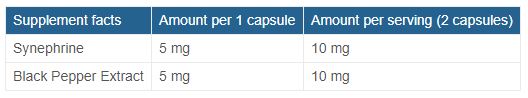 Съставки: Синефрин, екстракт от черен пипер, малтодекстрин E466 - карбоксиметилцелулоза, магнезиев стеарат E470b
