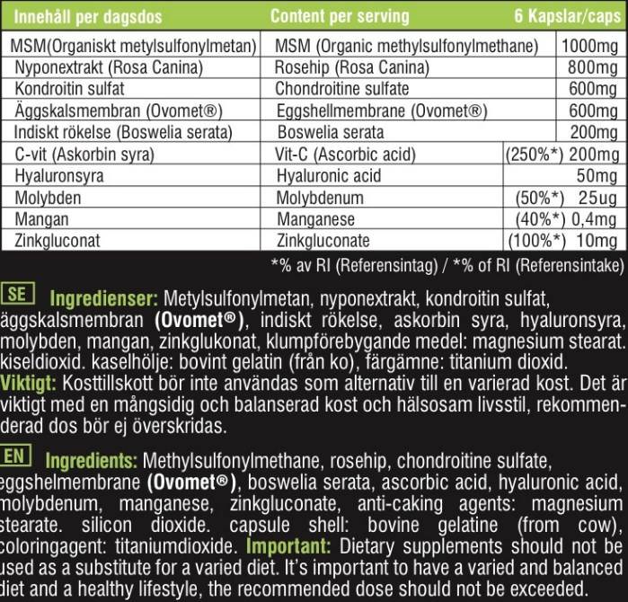 Съставки: MSM, Екстракт от шипка, Хондроитин сулфат,Мембрани от яйчени черупки,Екстракт от Босвелия серата, Витамин C, Хиалуронова киселина,Молибден,Манган, Цинк глюконат.