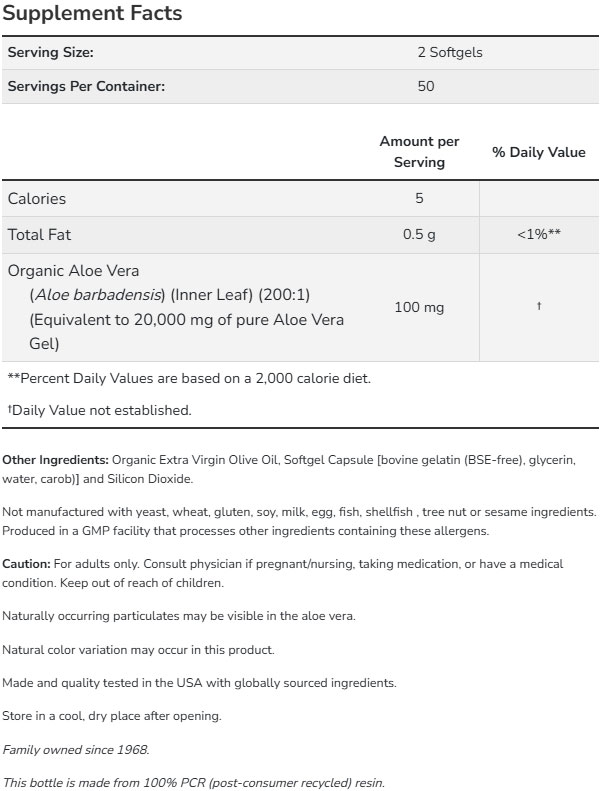 Съставки: Био алое вера, био екстра върджин зехтин, капсула Softgel (говежди желатин, глицерин, вода) и силициев диоксид.
