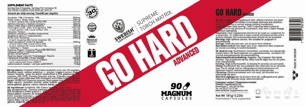 Go Hard Advanced на Swedish Supplements съдържа смес от най-известните и добре проучени съставки, които имат доказани свойства: екстракт от Йерба мате от Южна Америка, където се консумира като енергизиращ чай, HCA (хидрокси лимонена киселина), която може да потисне натрупването на мазнини, както и да намали апетита и на последно място, аминокиселината L-тирозин и екстракт от малина.