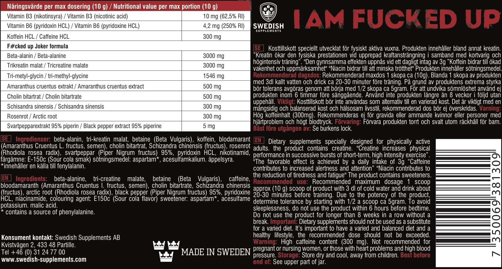 Swedish Supplements F#cked Up (Joker Edition) е мощен предтренировъчен продукт, разработен с една-единствена цел – да ви даде фокуса, силата и енергията, необходими да достигнете абсолютния си максимум и да счупите всичките си рекорди!
