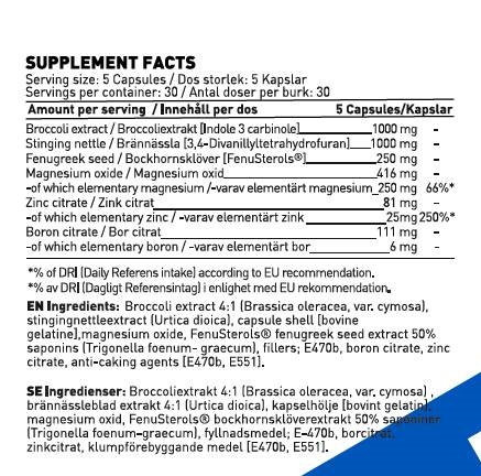 Съставки: екстракт от броколи, екстракт от коприва, екстракт от семена на сминдух, магнезиев оксид, цинк глюконат, борен цитрат; Помощни вещества: обвивка на капсулата /говежди желатин, оцветител - титаниев диоксид/, антислепващи агенти: магнезиев стеарат, силициев диоксид
