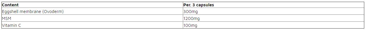 Съставки в 1 доза (3 капсули): мембрана от яйчена обвивка 300 мг, метил сулфонил метан 1200 мг, витамин c 100 мг