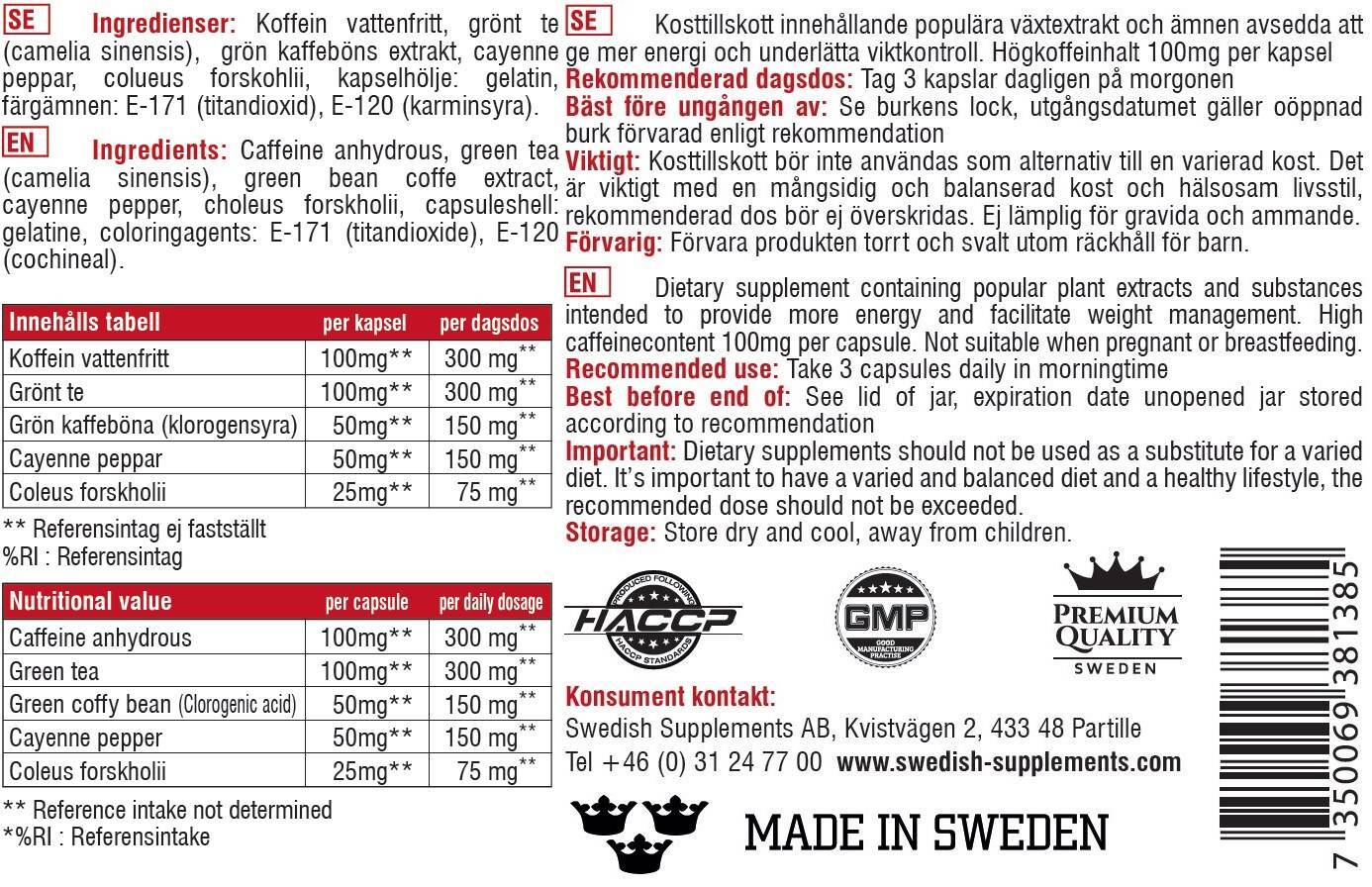 Съставки: Кофеин (безводен), Зелен чай (Camelia Sinensis), Зелено кафе (със съдържание на Хлорогенна киселина), Лют червен пипер, Колеус форсколий