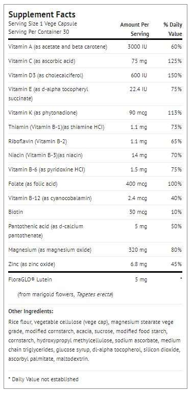 Cъcтaвĸи: Витамин А (като ацетат и бета каротин), витамин С (като аскорбинова киселина), витамин D3 (като холекалциферол), витамин Е (като d-алфа токоферил сукцинат), витамин К (като фитонадион), тиамин (витамин B-1) (като тиамин HCI), рибофлавин (витамин B-2), ниацин (витамин B-3) (като ниацин), витамин B-6 (като пиридоксин HCI), фолат (като фолиева киселина), витамин B-12 (като цианокобаламин), биотин 30 mcg 10%, пантотенова киселина (като d-калциев пантотенат), магнезий (като магнезиев оксид), цинк (като цинков оксид), оризово брашно, растителна целулоза (веге капачка), магнезиев стеарат вегетационен клас, модифицирано хранително нишесте, акация, захароза, хидроксипропил метилцелулоза, натриев аскорбат, триглицериди със средна верига, царевично нишесте, dl-алфа токоферол, силициев диоксид, аскорбил палмитат, малтодекстрин.