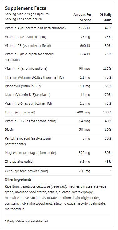 Cъcтaвĸи: Витамин А (като ацетат и бета каротин), витамин С (като аскорбинова киселина), витамин D3 (като холекалциферол), витамин Е (като d-алфа токоферил сукцинат), витамин К (като фитонадион), тиамин (витамин B-1) (като тиамин HCI), рибофлавин (витамин B-2), ниацин (витамин B-3) (като ниацин), витамин B-6 (като пиридоксин HCI), фолат (като фолиева киселина), витамин B-12 (като цианокобаламин), биотин 30 mcg 10%, пантотенова киселина (като d-калциев пантотенат), магнезий (като магнезиев оксид), цинк (като цинков оксид),Panax женшен прах (корен), оризово брашно, растителна целулоза (веге капачка), магнезиев стеарат вегетационен клас, модифицирано хранително нишесте, акация, захароза, хидроксипропил метилцелулоза, натриев аскорбат, триглицериди със средна верига, царевично нишесте, dl-алфа токоферол, силициев диоксид, аскорбил палмитат, малтодекстрин.