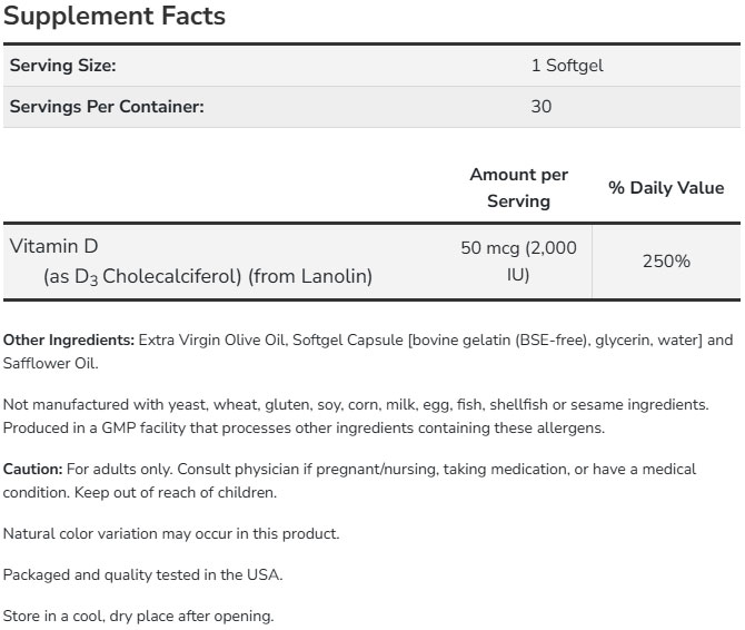 NOW Vitamin D-3 / 2000 IU е хранителна добавка, която е изключително ефикасна при лечение и защита от различни заболявания като рахит, остеопороза, мокреща екзема, косопад и язви. Витамин Д помага при възстановяването на организма особено при процеса по заздравяване на рани.