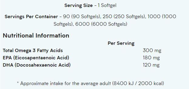 Съставки: Омега-3 рибено масло, софтгел обвивка (говежди желатин, влагозадържащ агент (глицерол)), антиоксидант (D-алфа-токоферол), рафинирано соево масло