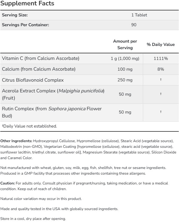 Cъcтaвĸи: Витамин С (от калциев аскорбат), калций (от калциев аскорбат), цитрусов биофлавоноиден комплекс, ацерола на прах (Malpighia punicifolia) (плодове), рутинов прах (Sophora japonica) (цветна пъпка), целулоза, стеаринова киселина (растителен източник), магнезий Стеарат (растителен източник), силициев диоксид и вегетарианско покритие