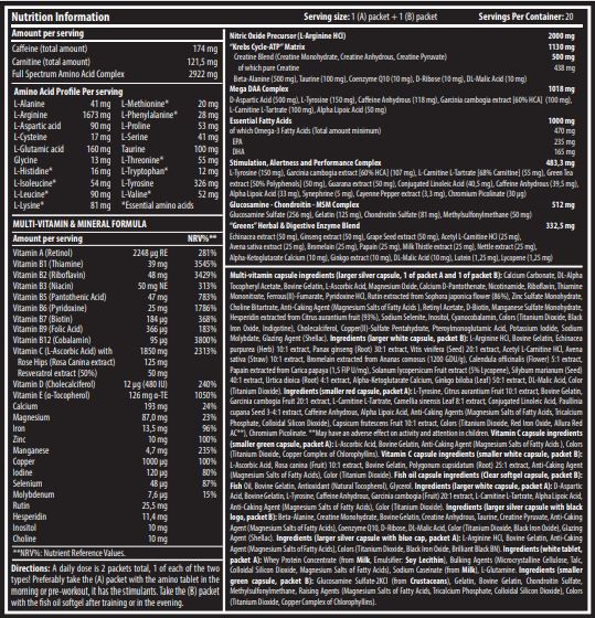 Съставки (по-голяма бяла капсула, пакет B): L-аргинин HCl, говежди желатин, Echinacea purpurea (Билка) 10: 1 екстракт, Panax женшен (корен) 30: 1 екстракт, Vitis vinifera (семена) 20: 1 екстракт, ацетил L -Карнитин HCl, Avena sativa (Слама) 10: 1 екстракт, Бромелаин, извлечен от Ananas comosus (1200 GDU / g), Calendula officinalis (Цвете) 5: 1 екстракт, Папаин, извлечен от Carica papaya (1.5 FIP U / mg), Solanum lycopersicum Плодов екстракт (5% ликопен), Silybum marianum (семе) 40: 1 екстракт, Urtica dioica (корен) 4: 1 екстракт, алфа-кетоглутарат калций, екстракт от гинко билоба (лист) 50: 1, екстракт от DL-ябълчена киселина, цвят (Титанов диоксид).