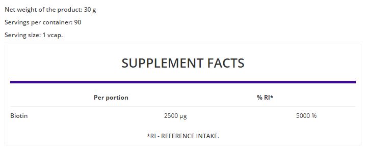 Съставки: Биотин (D-биотин), малтодекстрин, покритие (набухвател: хидроксипропил метилцелулоза; желиращ агент: гума Гелан; оцветители: еритрозин, титанов диоксид, индигокармин).