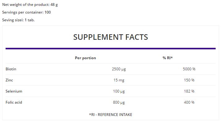 Съставки: Биотин (D-биотин), цинк (цинк пиколинат), селен (Л-селенометионин), фолиева киселина (птероилмоноглутаминова киселина), пълнител: микрокристална целулоза; нишесте, анти-слепващи агенти: калциев карбонат, силициев диоксид, магнезиеви соли на мастни киселини