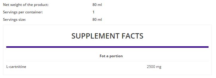 L-Carnitine Shot е висококонцентриран продукт, който във всяка порция - 12,5 ml съдържа до 1500 mg L-карнитин.
