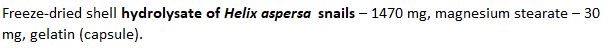 Съставки:1470мг лиофилизиран хидролизат от черупки на градински охлюв, 30мг магнезиев стеарат