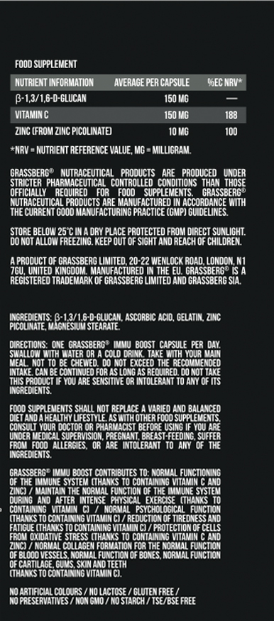 GRASSBERG Immu Boost – Beta са таблетки, които повишават вашата имунна система и подобряват общото състояние. Бета глюканите в продукта са естествени полизахариди, които се грижат за имунната ви система. Глюканите помагат на тялото да се пребори с умората и отпадналостта, като помага при заболявания като астма и диабет.