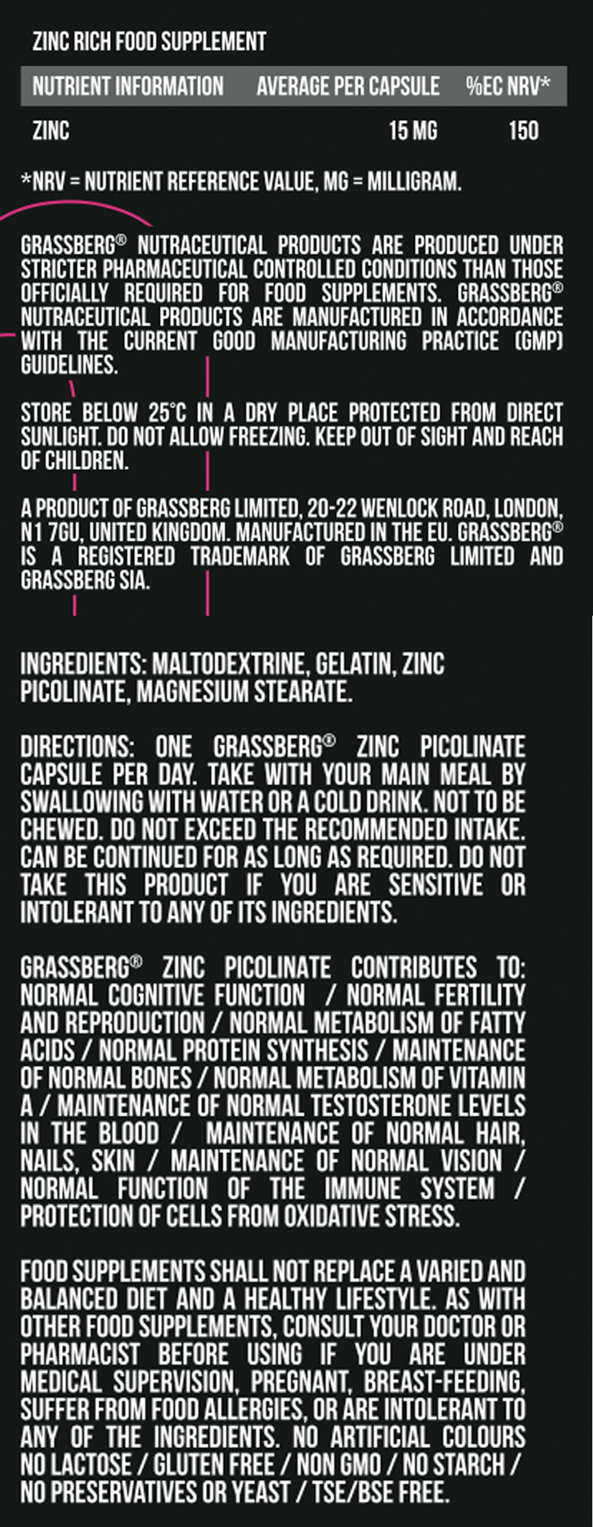 GRASSBERG Zinc Picolinate 15mg - High Absorbtion е формула с високо съдържание на цинк, който се грижи за здравето на костите, ставите, хрущялите, косата и кожата. Цинкът участва активно в подсилването на имунната защита, като помага на тялото да се справи с вирусните заболявания.