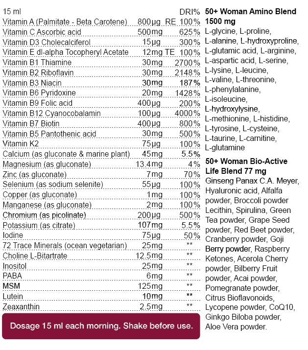 Формулата съдържа: наситена с белтъци „суперзелена“ смес от броколи, спирулина и люцерна на прах, която помага за балансирания хранителен прием; висококачествен аминокомплекс, който включва BCAA и спомага за мускулния растеж и възстановяването след физическо напрягане; витамин C и витамин D3, които подсилват имунната система; хиалуронова киселина за хидратация и еластичност на кожата; L-аргинин за подобрено кръвообращение; комплекс от ниацин, женшен и витамин B12, който намалява умората и повдига настроението и намаляват рисковете от анемия; високо съдържание на калций, който може да предотврати развитието на остеопороза, тъй като жените в тази възраст са предразположени към нея.