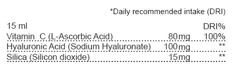 Съставки: филтрирана вода, веган хиалуронова киселина, регулатор на киселинността (лимонена киселина, ябълчена киселина), аскорбинова киселина, натурален жълт оцветител (куркума), консервант за свежест (калиев сорбат, натриев бензоат), силициев диоксид, подсладител (стевиол гликозиди), натурален аромат (лимон), 100% натурални аромати и оцветители