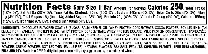 Cъcтaвĸи: Аромат на шоколад (захар, масло от палмови ядки, суроватъчен протеинов концентрат, какао на прах, соев лецитин [емулгатор], ванилия), протеинова смес (суроватъчен протеинов концентрат, суроватъчен протеинов изолат, млечен протеинов концентрат, хидролизиран суроватъчен протеинов изолат, калций Казеинат), глицерин, царевичен сироп, суроватъчен чипс (суроватъчен протеинов изолат, концентрат от суроватъчен протеин, нишесте от тапиока, калциев карбонат, соев лецитин [помощно средство за обработка]), подсладено кондензирано обезмаслено мляко (млечни твърди вещества, захароза), вода, желатин, захар, Бадеми, боровинки (боровинки, захар, слънчогледово масло), масло от палмови ядки, инвертен сироп, какао на прах, крем на прах, соев лецитин (емулгатор), натурални аромати, морска сол, фъстъци.