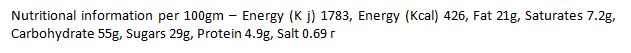 Съставки: Пълнозърнест овес, зеленчуков маргарин, вода, сол, емулгатор: полиглицеролови естери на мастни киселини, оцветител: куркумин, златен сироп череши, глюкозо-фруктозен сироп, лимонена киселина. Може да съдържа следи от ядки, мляко и соя.