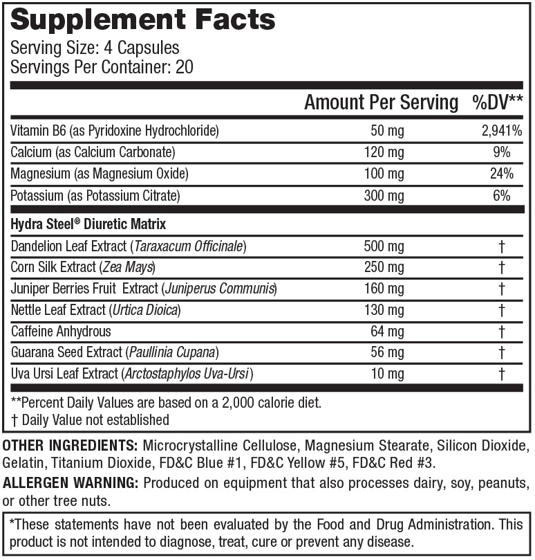 STEELFIT Hydra Steelпомага за освобождаване на тялото от излишната вода в организма, която често е основната причина за подуване. Продуктът съдържа магнезий, който е необходим на тялото при производството на енергия, както и за подпомагане синтеза на протеини и подсилване на костите. Мечото грозде също е една от съставките в продукта, която спомага за освобождаването на организма от излишната вода в организма.