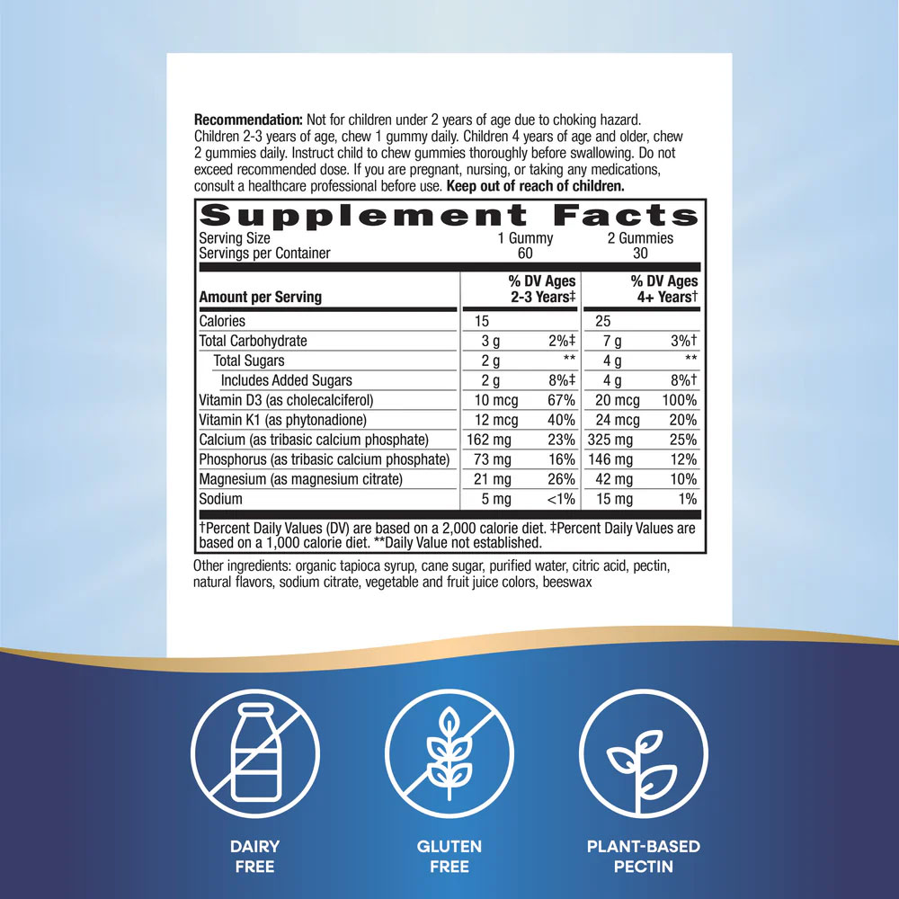 Съставки: Витамин D3 (като холекалциферол); Витамин К1 (като фитонадион); Калций (като трикалциев фосфат; фосфор (като трикалциев фосфат); магнезий (като магнезиев цитрат); натрий; органичен сироп от тапиока; тръстикова захар; пречистена вода; лимонена киселина; пектин; естествени аромати; натриев цитрат; зеленчукови и плодови сокови цветове; кокос Масло; Пчелен восък